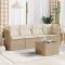 Salon de jardin avec coussins 5 pcs beige résine tresséeCet ensemble de canapés de jardin est le complément parfait de votre arrière-cour, terrasse ou patio, offrant un espace confortable et accueillant pour discuter avec la famille et les amis ou simplement se détendre et profiter de l'extérieur. Matériau durable : la résine tressée, également connue sous le nom de poly rotin, est un matériau synthétique solide et nécessitant peu d'entretien qui ressemble au rotin naturel. Il est léger, facile à nettoyer et couramment utilisé pour les meubles d'extérieur en raison de sa durabilité et de ses propriétés de résistance aux intempéries.Fonction de rangement avec sac résistant à l'eau : chaque siège de jardin dispose d'un espace de rangement sous l'assise, complété par un sac résistant à l'eau pour ranger les coussins, les jouets et d'autres objets. Les sacs intérieurs sont dotés d'un couvercle et peuvent être solidement fixés aux sièges à l'aide de bandes auto-agrippantes pour plus de stabilité.Dessus en verre : le dessus de la table d'extérieur est fabriqué en verre trempé solide et durable, ce qui le rend facile à nettoyer avec un chiffon humide et ajoute une touche d'élégance à votre espace extérieur.Housse amovible et lavable : ces coussins de siège sont dotés de housses amovibles pour un lavage et un entretien faciles.Conception modulaire : cet ensemble de meubles d'extérieur a une conception modulaire, ce qui le rend complètement flexible et facile à déplacer, afin que vous puissiez créer un agencement de meubles d'extérieur personnalisé. Bon à savoir :Pour que vos meubles d'extérieur restent beaux, nous vous recommandons de les protéger avec une housse imperméable.