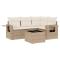 Salon de jardin avec coussins 5 pcs beige résine tresséeCet ensemble de canapés de jardin est le complément parfait de votre arrière-cour, terrasse ou patio, offrant un espace confortable et accueillant pour discuter avec la famille et les amis ou simplement se détendre et profiter de l'extérieur. Matériau durable : la résine tressée, également connue sous le nom de poly rotin, est un matériau synthétique solide et nécessitant peu d'entretien qui ressemble au rotin naturel. Il est léger, facile à nettoyer et couramment utilisé pour les meubles d'extérieur en raison de sa durabilité et de ses propriétés de résistance aux intempéries.Dessus en verre : le dessus de la table d'extérieur est fabriqué en verre trempé solide et durable, ce qui le rend facile à nettoyer avec un chiffon humide et ajoute une touche d'élégance à votre espace extérieur. Table d'appoint pratique : ce mobilier d'extérieur comprend des tables d'appoint pliables avec un ressort à gaz sur les accoudoirs, offrant des endroits pratiques pour garder vos essentiels à portée de main. Expérience d'assise confortable : ce mobilier d'extérieur, doté de coussins épais, offre une expérience d'assise confortable.Conception modulaire : cet ensemble de meubles d'extérieur a une conception modulaire, ce qui le rend complètement flexible et facile à déplacer, afin que vous puissiez créer un agencement de meubles d'extérieur personnalisé. Bon à savoir :Pour que vos meubles d'extérieur restent beaux, nous vous recommandons de les protéger avec une housse imperméable.