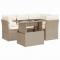 Salon de jardin avec coussins 5 pcs beige résine tresséeCet ensemble de canapés de jardin est le complément parfait de votre arrière-cour, terrasse ou patio, offrant un espace confortable et accueillant pour discuter avec la famille et les amis ou simplement se détendre et profiter de l'extérieur. Matériau durable : la résine tressée, également connue sous le nom de poly rotin, est un matériau synthétique solide et nécessitant peu d'entretien qui ressemble au rotin naturel. Elle est légère, facile à nettoyer et couramment utilisée pour les meubles d'extérieur en raison de sa durabilité et de ses propriétés de résistance aux intempéries.Fonction de rangement avec sac résistant à l'eau : chaque siège de jardin dispose d'un espace de rangement sous l'assise, complété par un sac résistant à l'eau pour ranger les coussins, les jouets et d'autres objets. Le sac intérieur est doté d'un couvercle et peut être solidement fixé au siège à l'aide de bandes auto-agrippantes pour plus de stabilité.Dessus de table réglable : le dessus de table peut être soulevé pour rendre la table plus haute, ce qui transforme la table d'extérieur d'une table basse à une table de salle à manger. Elle est parfaite pour recevoir des invités ou prendre des repas à l'extérieur.Housse amovible et lavable : ces coussins de siège sont dotés de housses amovibles pour un lavage et un entretien faciles.Cadre robuste et stable : le cadre en acier enduit de poudre est solide, stable, durable et résistant à la corrosion et aux intempéries, ce qui garantit des performances durables. Bon à savoir :Pour que vos meubles d'extérieur restent beaux, nous vous recommandons de les protéger avec une housse imperméable.