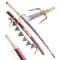 Magnifique reproduction du sabre de Mugen "le Typhoon Swell" inspiré de l'univers de Mugen. La lame avec double tranchant est en acier inoxydable stainless 440, elle est pré-affutée mais non tranchante. Le manche est recouvert d'un tsuka maki (laçage) beige. Le pommeau et le tsuba, en forme de trident, sont en laiton poli. Le fourreau en bois mat bordeau est décoré d'un symbole . Une bandoulière en tissu fait main couleur vanille-vert est accrochée à des garnitures en laiton. Finitions impeccables.