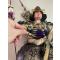 Tête et torse en bois sculpté, vêtements en brocart de soie ornés, armure laquée et accessoires détaillés.