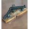 Sculpture décorative non fonctionnelle représentant un fusil à pompe (pump-action shotgun), entièrement assemblée et soudée à la main à partir de matériaux métalliques recyclés.