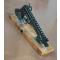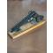 Socle : planche de bois brut, fixée par des étriers métalliques forgés.