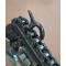 Crosse et partie du garde-main : maillons de chaînes (vraisemblablement de vélo ou de moto) soudés, créant une texture ajourée et organique.