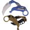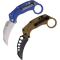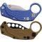 Set de 2 karambits Reate Knives EXO-K Button Lock Blue Aluminium Handle SW N690 Blade Clip + Trainer pliants - Longueur ouvert 16.99 cm - Longueur fermé 11.43cm - Longueur de lame 7.95cm - Epaisseur de lame 4mm - Lame de type hawkbill plain edge finition stonewash - Lame en acier N690 - Dureté 60HRC - Plaquettes du manche en aluminium blue - Anneau en bout de manche - Système de sécurité button lock - Clip de poche - Le Karambit d'entrainement - Manche Tan - Lame non affutée