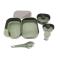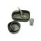 Il se compose de l'assiette et son convercle, une salière/poivrier, planche à découper, gobelet, tasse flexible et son couvert triple fonction.