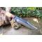 Couteau de Survie Bowie Chasse à lame fixe - Longueur totale 35cm - Longueur de lame 22cm - Longueur du tranchant 20cm - Lame en acier carbone 1075 - Lame type clip point plain edge finition brut de forge - Construction d'une seule pièce - Manche en 3 bois - Entretoises en laiton - Trou pour dragonne - Etui cuir - Fabrication Artisanale