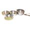 deux casseroles/assiettes, une assiette et un convercle. La poignée de transport sert de poignée de casserole
