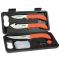 Set de découpe chasseur Wild-Lite de Outdoor Edge comprenant 6 pièces : - 1 boîtier rigide à poignée - 1 couteau à dépecer, lame 6,5 cm - 1 couteau skinner Gut-Hook, lame 10 cm - 1 couteau à désosser/fileter, lame 13 cm manches orange anti-dérapant - 1 affûteur manuel de couteau au carbure de tungstène - 1 paire de gants en nylon Poids total : 562 g Dimensions boite fermée : Longueur 27 cm x 13 cm x 4 cm