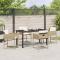Set de salle à manger de jardin 5 pièces avec coussins beige en poly rattanCet ensemble de salle à manger de jardin combine style et confort avec un design moderne qui s'intègre super bien dans tout espace extérieur. Parfait pour se retrouver en famille ou passer du temps entre amis, il a des chaises confortables avec de doux coussins, et une table assortie qui améliore ton expérience dehors, que tu dînes sur la terrasse, le balcon ou dans le jardin. Profite d'un repas dehors sans stress avec une table robuste et des sièges confortables. Fabriqué en rattan PE qui résiste aux UV, il ne se décolore pas au soleil. Les chaises ont des coussins épais pour une expérience de repas super agréable. Les chaises pliantes offrent un rangement compact quand tu ne les utilises pas. Les housses des coussins sont amovibles et vont à la machine, rendant le nettoyage super simple. Maximum 110 kg par siège. Soyez conscient du risque de feux ouverts et d'autres sources de forte chaleur à proximité du produit.