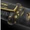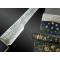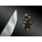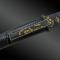La fusée est en galuchat blanc, tressé noir, garnie d’une paire de ménuki noirs figurants un shishi aux yeux dorés.