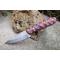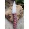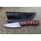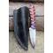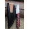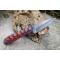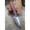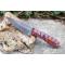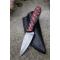 Longueur du manche 9.5cm - Longueur de la lame 8.5cm - Lame en Acier damas 256 couches - Lame de type trailing point - Construction d'une seule pièce - Full tang - Plaquettes du manche en bois blue/red 3D - Fabrication Artisanale - Les dessins de la lame sont uniques comme une empreinte - Etui simili cuir