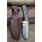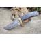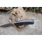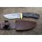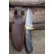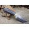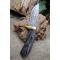 Skinner Bowie lame damas - Longueur du manche 11cm - Longueur de la lame 10cm - Lame en Acier damas 256 couches - Lame de type drop point - Construction d'une seule pièce - Full tang - Guillochage côté manche - Plaquettes du manche en bois - Garde en laiton - Fabrication Artisanale - Les dessins de la lame sont uniques comme une empreinte - Etui simili cuir