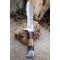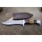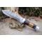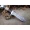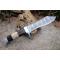 Skinner Bowie lame damas - Longueur du manche 12.5cm - Longueur de la lame 15cm - Lame en Acier damas 256 couches - Lame de type Clip point recurve - Manche en os & bois - Garde en nickel - Pommeau en nickel - Fabrication Artisanale - Les dessins de la lame sont uniques comme une empreinte - Etui cuir