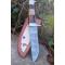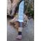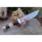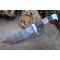 Skinner Bowie lame damas - Longueur du manche 13cm - Longueur de la lame 15.5cm - Lame en Acier damas 256 couches - Lame de type drop point - Manche en os & bois - Garde en nickel - Pommeau en nickel - Fabrication Artisanale - Les dessins de la lame sont uniques comme une empreinte - Etui cuir avec insert peau