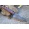 Longueur du manche 11cm - Longueur de la lame 10cm - Lame en Acier damas 256 couches - Lame de type santoku - Construction d'une seule pièce - Full tang - Fine lame idéal pour la cuisine - Plaquettes du manche en bois de rose - Fabrication Artisanale - Les dessins de la lame sont uniques comme une empreinte - Etui simili cuir