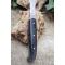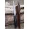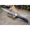 Longueur du manche 13.5cm - Longueur de la lame 17cm - Epaisseur de lame 5mm - Lame en Acier carbone avec dessins façon damas - Lame de type Trailing Point - Construction d'une seule pièce - Full tang - Plaquettes du manche en micarta - Trou pour dragonne - Fabrication Artisanale - Les dessins de la lame sont uniques comme une empreinte - Etui simili cuir - Idéal pour les sorties rando et chasse sur place