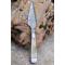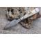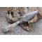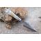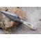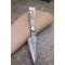 Longueur du manche 6.5cm - Longueur de la lame 7cm - Lame en Acier damas 256 couches - Lame de type harrow - Construction d'une seule pièce - Full tang - Mitres en acier - Plaquettes du manche en os - Fabrication Artisanale - Les dessins de la lame sont uniques comme une empreinte - Etui cuir