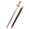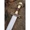 Il s'agit de la reconstitution de la spatha telle qu'elle était effectuée dans la zone de peuplement germanique du Ier au VIe siècle. La lame est forgée en acier à ressort de haute qualité et durcie à environ 48 HRC. Il a un plein prononcé, ce qui donne à l'épée une grande élasticité et légèreté en même temps. Le tranchant n'est pas affûté. Le pommeau et la traverse sont constitués de plaques de laiton rivetées, qui contiennent un disque de corne à l'intérieur. Le manche est en bois, laiton et corne.
