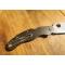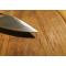 La lame est en acier laminé ZDP-189 fabriqué au Japon. C'est un acier de très bonne qualité, trés résistant. Il est laminé entre deux portions d'un acier plus tendre et chromé (420J), ce qui donne un poli miroir à la lame, mais favorise de potentielles rayures (ce couteau en présente quelques-unes mais relativement mineures : voir photos) et permet de montrer un "hamon" caractéristique sur la lame.