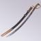 Oreillons décorées de trophées d’armes, garde droit orné pour l’un d’une tête de serpent, l’autre s’effile pour former la branche. Calotte en tête de lion, la poignée en ivoire à filigrane de fil de laiton torsadé.