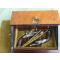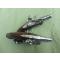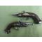 1 paire de pistolet 18ème à Silex et des objets divers: deux fioles en cristal pour l'encre, 1 plume factice en fer et un petit tournevis.