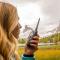 Le boîtier noir mat résiste aux griffes en terrain accidenté. Les touches sont bien espacées, idéales même avec des gants. L'écran LCD affiche les informations essentielles : numéro de canal, niveau batterie, puissance émise. La courroie de maintien fournie sécurise l'appareil à votre ceinture ou sac.
