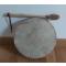 Diamétre : 30 cm , Fabriqué à partir d'une peau d'orignal ou wapiti fumée, tendue sur  un cercle en bois avec les boyaux de l'animal.