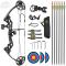 Ce kit d'arc récréatif de Topoint comprenant un arc à poulies pour les jeunes, un viseur à 3 broches, un repose flèches-capture , une visette de corde, un carquois de flèches, un protège-bras, des blasons de cible, six flèches et des clés hexagonales.