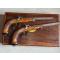 Les platines à percussion sont gravées de décoration de rocaillle. Crosses loupe d'orme. Accessoires en fer gravé. Longueur de chaque pistolet 40 cm.