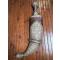 Manche en corne à incrustation d'argent, lame courbe à double tranchant avec arrête centrale, la lame comporte une petite gravure et une signature , fourreau bois habillé de cuir cousu,richement décoré en argent tressé et travaillé au .