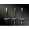 Ces trois armes d’escot, appelées fleurets, et réservée à l’escrime, sont à poignée droite, garde en aluminium et lame de section carrée, terminée en bouton, marquée sur un pan de poinçons à l’étoile centrée « PARE ».
