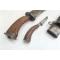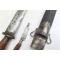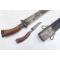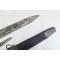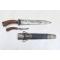 Lames de 29.8cm et de 8.2cm, patinées gris et taches d'oxydation de surface éparses. La lame du petit couteau est marqué de [M?]uller à Ulm.