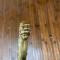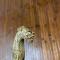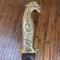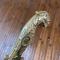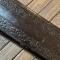Manche bronze sculptée à tête de personnages fantastiques barbus, lame type machette avec marquages et fourreau en cuir à décor floral sur une face.