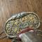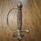 Epée de Cour a pas d'ânes à la française debut XVIII éme lame droite lenticulaire à six pans plats, monture en fer entièrement gravée sur fond d'or fin, plateau bivalve à décor d'angelots et de cavalières montant en amazone brandissant un trident, décor gravé sur les deux faces des deux plateaux , pommeau rond également décoré de gravure sur lignée d'or , bouton de rivure proéminent, branche de garde unique toujours gravé à l'or , quillon arqué vers l'avant à terminaison anthropomorphe, fusée à quatre pans habillés d'une feuille de cuivre et d'un triple filigrane à refixer à une extrémité.