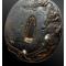 Tsuba maru gata animé de deux personnages assis portant des masques d’argent, une branche surplombe la scène, incrusté de perles de laiton.