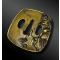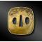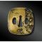 Tsuba en sentoku ciselé d’un homme vêtu d’un kimono et d’un bonnet, tenant dans ses mains un rouleau et portant une barbe ; sur la partie gauche figure un arbre qui se poursuit au revers ; le tout rehaussé de shakudo, d’argent, d’or et de cuivre.