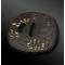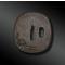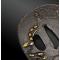 Tsuba en fer décoré de cinq personnages à têtes en cuivre et argent dans une barque, certains portant des coiffes dorées ; au second plan est représenté un arbre aux feuilles de laiton et d’or, un moulin à eau et une muraille, le tout rehaussé à l’or.