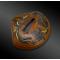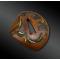 Tsuba en forme de palourde, appelé “hamaguri” en japonais, en shibuichi, décoré d’algues en shakudo et laiton ; deux traits divergents figurent sur la coquille.