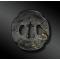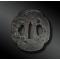 Tsuba en fer ciselé d’un homme en kimono lisant sur un pont situé sous un arbre, où traverse une rivière, le tout rehaussé d’or, d’argent et de cuivre.