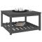 Table de jardin gris 82,5x82,5x45 cm bois massif de pinProfitez d'un bon repas avec votre famille et vos amis autour de cette table de jardin en bois ! Elle apportera une touche d'élégance à votre patio, jardin ou terrasse. Bois de pin massif : le bois de pin massif est un matériau naturel magnifique. Le bois de pin a un grain droit et les noeuds donnent au matériau son aspect caractéristique et rustique.Dessus de table stable : le dessus de table offre un excellent support pour accueillir vos boissons, collations, corbeilles de fruits et vos décorations préférées.Espace de rangement supplémentaire : la table de terrasse est conçue avec une étagère ouverte qui offre un espace de rangement supplémentaire pour garder vos divers objets quotidiens bien organisés et à portée de main.Structure robuste : le cadre en bois assure la solidité et la stabilité de la table de salon.Applications larges : la table de salon de jardin, avec son design remarquable, crée un aspect général agréable qui s'intègre sans effort dans n'importe quel décor. Bon à savoir :Pour faciliter au maximum le montage, chaque produit est livré avec des instructions.Remarque :Pour que vos meubles d'extérieur restent beaux, nous vous recommandons de les protéger avec une housse imperméable.