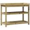 Table de rempotage avec étagères 108x45x86,5 cm bois massif pinCette table de rempotage en bois est parfaite pour organiser et présenter vos plantes en pot à la maison, dans un jardin, sur un patio ou sur une terrasse. Bois imprégné : la table de rempotage est fabriquée en bois de pin massif. Le bois de pin massif est un matériau naturel magnifique. Le bois de pin a un grain droit et les noeuds lui confèrent un aspect rustique caractéristique. L'imprégnation est un processus de conservation réalisé à l'aide d'autoclaves. Le traitement sous pression augmente la résistance à la pourriture et aux intempéries.Grand espace de rangement : l'établi de rempotage avec étagères ouvertes offre suffisamment d'espace pour les objets connexes tels que les petits outils de jardinage, la terre, les engrais, etc.Ventilée : ce banc de rempotage d'extérieur avec un design à lattes permet à l'eau de s'écouler, ce qui la rend difficile à pourrir et assure une longue durée de vie.Applications multiples : la station d'empotage peut non seulement apporter un sentiment de nature à votre espace, mais peut également être un complément parfait à votre cour, jardin, serre, etc. Bon à savoir :Pour que vos meubles d'extérieur restent beaux, nous vous recommandons de les protéger avec une housse imperméable.
