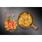 Spaghettis(42%(blé, eau, curcuma), bouillon de légumes, huile de colza, poivron rouge (11,3%), carottes (11,3%), haricots (7,5%), oignons (7,5%), tomates (7,5%), olives(4,5%), ail, épices, fines herbes, sel.