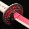 Le Tsuka en bois est composé d'un pommeau en métal doré et d'un cordage synthétique blanc qui recouvre un simili cuir de couleur rose avec finition peau de raie.