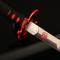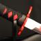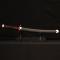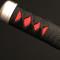 Celui-ci se compose d'une lame en acier inoxydable 440 très réussie, d'un Tsuba Flamme en métal peint et d'un Tsuka en bois avec cordage synthétique noir recouvrant une beau simili effet peau de raie couleur rouge.