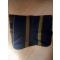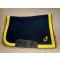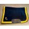 Tapis de selle de la Cavalerie Belge. Insigne brodé de chasseur. Drap bleu, liserés jaunes. Protections en cuir pour bottes et sabre. Doublure en drap de couverture armée française datée 1914. Très bon état