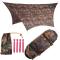Souple et résistant à la fois, le Traveller Tarp camouflage de la marque Amazonas bénéficie d'une construction en nylon Ripstop avec enduction PUR (polyuréthane). Résultat : il est à la fois facile à transporter, durable et très imperméable (étanchéité : 3000 mm), au même titre que les meilleurs modèles de survie, de bivouac engagé ou de grande randonnée. À tout cela, on peut ajouter la légèreté : poids total de 800 grammes. Outre un gain de poids, sa forme de trapèze lui donne toute la polyvalence nécessaire. On peut l'installer de différentes façons : toit à double pente ou toit à simple pente. Sa taille totale (340 x 280 cm) donne la possibilité d'un abri pour 1 personne (confortablement) ou 2 personnes (en mode minimaliste). Les accessoires fournis avec ce tarp Amazonas sont les suivants : 4 piquets, 2 mousquetons et toutes les cordelettes nécessaires (suspentes). Remarque : ces dernières (cordelettes) peuvent être rangées dans les petites poches situées à chaque coin de la bâche si on ne s'en sert pas.