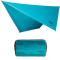 Son poids est plutôt bien situé par rapport à la concurrence : 350 grammes. On peut parler de tarp léger. Quant à son volume rangé, celui-ci obtient les meilleures notes : longueur de 17 cm et diamètre de 8 cm. On peut parler de tarp compact. La housse est comprise avec le tarp, de même que les cordes et les crochets. Sorti de la housse, c'est un tarp asymétrique qui offre des dimensions assez généreuses : 3,60 mètres par 2,80 mètres. Il est solide, léger et imperméable : tissu nylon Ultra-Sil Nano 15D avec 5 points d'accroche Hypalon très résistants. Ce type de matériel est autant adapté à de la survie, à de la grande randonnée ou à du bivouac en pleine nature. Coloris : bleu turquoise.