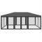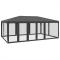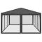 Tente de fête avec 10 parois latérales maille anthracite 6x4 mCette tente de réception super cool, avec un cadre en fer robuste, un toit résistant à l'eau et dix parois latérales en maille, est un abri idéal contre le soleil. Matériau de qualité supérieure : cette tente de jardin est fabriquée en polyéthylène haute densité (PEHD) qui vous protège de la lumière directe du soleil et permet suffisamment de vent. La PEHD est spécialement traitée, elle est donc également résistante à l'eau.Cadre en fer : le cadre en fer de cette tente de jardin assure robustesse et stabilité.Design pratique : la tente est dotée de dix parois latérales en filet, qui vous protègent des insectes gênants. Et l'une des parois latérales est dotée de 2 fermetures à glissière pour une entrée et un accès facile.Larges applications : cette tente d'événements est un choix idéal pour un large éventail d'événements en plein air, tels que des spectacles, des mariages, des fêtes, des barbecues, des festivals, etc. Bon à savoir :Ce produit ne doit JAMAIS être utilisé par mauvais temps, tel que vent fort, pluie abondante, neige, tempête, etc. Tenez les enfants et les animaux domestiques à l'écart de la zone d'assemblage jusqu'à ce que le travail soit terminé. Certaines pièces peuvent présenter des arêtes vives, portez des gants de protection si nécessaire. Le gazebo doit être positionné et fixé uniquement sur une surface plane et horizontale. N'essayez pas d'assembler le gazebo dans des conditions venteuses ou humides. Ne placez pas votre gazebo dans une zone exposée à un vent excessif. Si vous utilisez des outils électriques ou une échelle, suivez toujours les instructions de sécurité du fabricant pour éviter les blessures. NE PAS utiliser de flammes nues dans le gazebo ou à proximité du pavillon. Les objets chauds tels que les grils récemment utilisés, les chalumeaux, etc. ne doivent pas être entreposés dans le pavillon de jardin. Assurez-vous que l'abri de jardin est conforme aux normes de construction locales. Fixez le pavillon à l'aide des chevilles fournies.