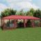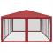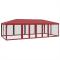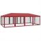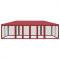 Tente de fête avec 12parois latérales en maille rouge 8x4m PEHDCette tente de réception super cool, avec un cadre en fer robuste, un toit résistant à l'eau et douze parois latérales en maille, est un abri idéal contre le soleil. Matériau de qualité supérieure : cette tente de jardin est fabriquée en polyéthylène haute densité (PEHD) qui vous protège de la lumière directe du soleil et permet suffisamment de vent. La PEHD est spécialement traitée, elle est donc également résistante à l'eau.Cadre en fer : le cadre en fer de cette tente de jardin assure robustesse et stabilité.Design pratique : la tente est dotée de douze parois latérales en filet, qui vous protègent des insectes gênants. Et l'une des parois latérales est dotée de 2 fermetures à glissière pour une entrée et un accès facile.Larges applications : cette tente d'événements est un choix idéal pour un large éventail d'événements en plein air, tels que des spectacles, des mariages, des fêtes, des barbecues, des festivals, etc. Bon à savoir :Ce produit ne doit JAMAIS être utilisé par mauvais temps, tel que vent fort, pluie abondante, neige, tempête, etc. Tenez les enfants et les animaux domestiques à l'écart de la zone d'assemblage jusqu'à ce que le travail soit terminé. Certaines pièces peuvent présenter des arêtes vives, portez des gants de protection si nécessaire. Le gazebo doit être positionné et fixé uniquement sur une surface plane et horizontale. N'essayez pas d'assembler le gazebo dans des conditions venteuses ou humides. Ne placez pas votre gazebo dans une zone exposée à un vent excessif. Si vous utilisez des outils électriques ou une échelle, suivez toujours les instructions de sécurité du fabricant pour éviter les blessures. NE PAS utiliser de flammes nues dans le gazebo ou à proximité du pavillon. Les objets chauds tels que les grils récemment utilisés, les chalumeaux, etc. ne doivent pas être entreposés dans le pavillon de jardin. Assurez-vous que l'abri de jardin est conforme aux normes de construction locales. Fixez le pavillon à l'aide des chevilles fournies.